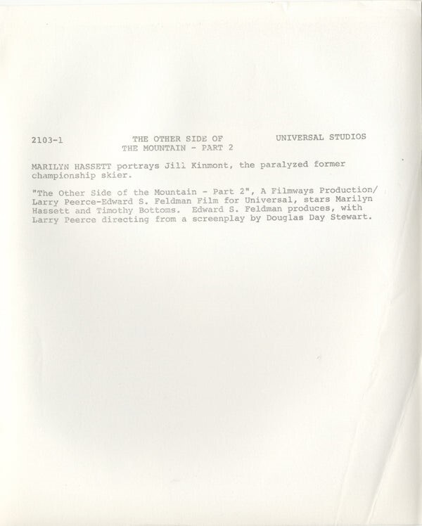 Other Side of the Mountain Part 2 Marilyn Hassett portrait Original 8x10 Photo 1978 - VG Condition This item is an ORIGINAL 8x10 photo from the historic archives of Silver Screen Mementos. This original photograph was made in the actual year the film, television show or event was produced. The movie studios produced publicity photographs for distribution to the press, photo agencies and publicity departments to advertise the film/tv show or event. Very often original photos have press release information on the reverse of the photo - movie credits, description of the scene, event and people involved. This is a historic piece of cinema art and is being offered from one collector to another, no rights given or implied. Silver Screen are gradually releasing thousands of Original Photographs, Transparencies, Negatives, Lobby Cards, Posters, Magazines and other memorabilia from our historic archive.