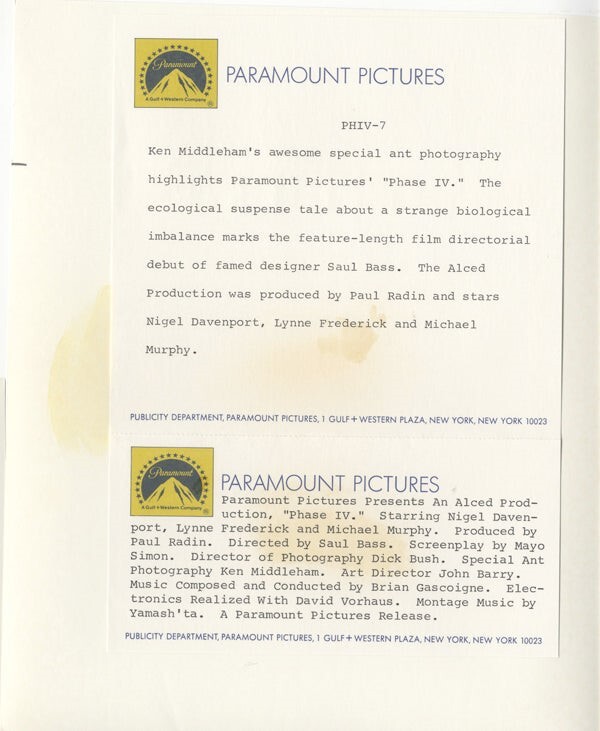 Phase IV 4 giant ant cult sci-fi 1973 Original 8x10 Photo with snipe directed by Saul Bass - Near Mint This item is an ORIGINAL 8x10 photo from the historic archives of Silver Screen Mementos. This original photograph was made in the actual year the film, television show or event was produced. The movie studios produced publicity photographs for distribution to the press, photo agencies and publicity departments to advertise the film/tv show or event. Very often original photos have press release information on the reverse of the photo - movie credits, description of the scene, event and people involved. This is a historic piece of cinema art and is being offered from one collector to another, no rights given or implied. Silver Screen are gradually releasing thousands of Original Photographs, Transparencies, Negatives, Lobby Cards, Posters, Magazines and other memorabilia from our historic archive.