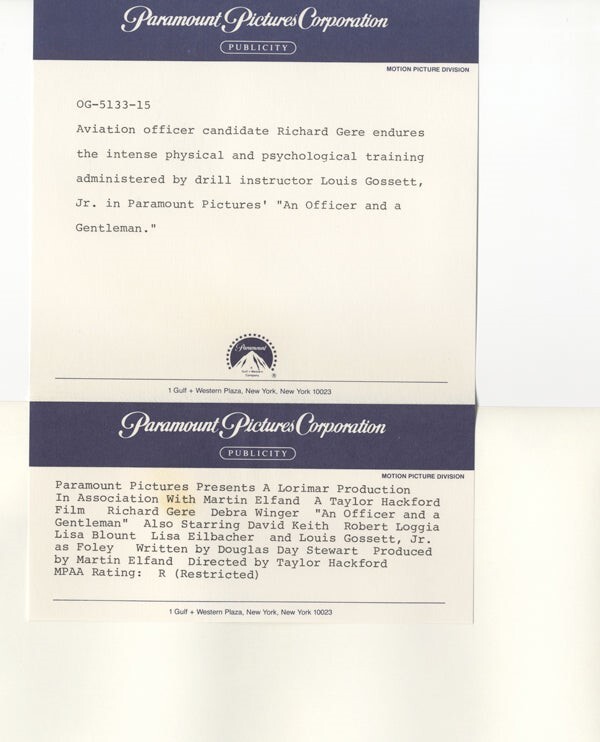 An Officer & A Gentleman Richard Gere Louis Gossett Jr Original 8x10 Photo VG?near Mint This item is an ORIGINAL 8x10 photo from the historic archives of Silver Screen Mementos. This original photograph was made in the actual year the film, television show or event was produced. The movie studios produced publicity photographs for distribution to the press, photo agencies and publicity departments to advertise the film/tv show or event. Very often original photos have press release information on the reverse of the photo - movie credits, description of the scene, event and people involved. This is a historic piece of cinema art and is being offered from one collector to another, no rights given or implied. Silver Screen are gradually releasing thousands of Original Photographs, Transparencies, Negatives, Lobby Cards, Posters, Magazines and other memorabilia from our historic archive.