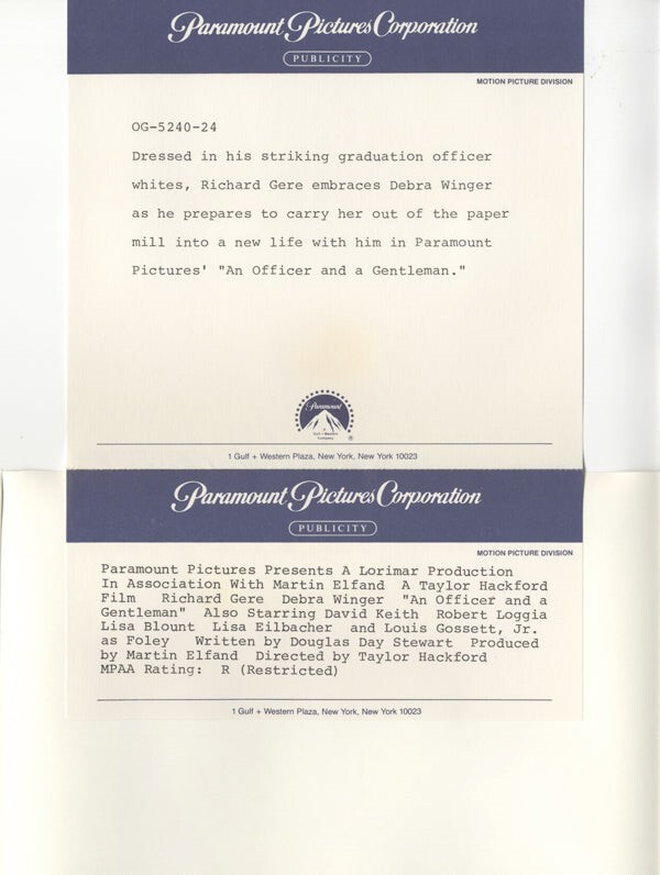 An Officer & A Gentleman Richard Gere kissing Debra Winger Original 8x10 Photo with paper caption snipe - Near Mint This item is an ORIGINAL 8x10 photo from the historic archives of Silver Screen Mementos. This original photograph was made in the actual year the film, television show or event was produced. The movie studios produced publicity photographs for distribution to the press, photo agencies and publicity departments to advertise the film/tv show or event. Very often original photos have press release information on the reverse of the photo - movie credits, description of the scene, event and people involved. This is a historic piece of cinema art and is being offered from one collector to another, no rights given or implied. Silver Screen are gradually releasing thousands of Original Photographs, Transparencies, Negatives, Lobby Cards, Posters, Magazines and other memorabilia from our historic archive.