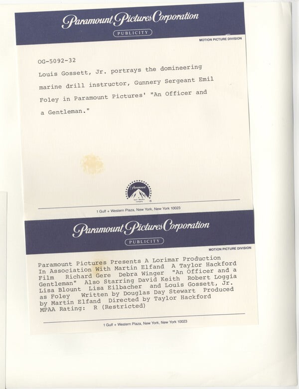 An Officer & A Gentleman Louis Gossett Jr 1982 Original 8x10 Photo with snipe - Near Mint Condition This item is an ORIGINAL 8x10 photo from the historic archives of Silver Screen Mementos. This original photograph was made in the actual year the film, television show or event was produced. The movie studios produced publicity photographs for distribution to the press, photo agencies and publicity departments to advertise the film/tv show or event. Very often original photos have press release information on the reverse of the photo - movie credits, description of the scene, event and people involved. This is a historic piece of cinema art and is being offered from one collector to another, no rights given or implied. Silver Screen are gradually releasing thousands of Original Photographs, Transparencies, Negatives, Lobby Cards, Posters, Magazines and other memorabilia from our historic archive.