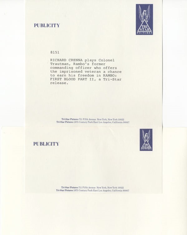 Richard Crenna Rambo First Blood Part 2 Original 8x10 Photo with snipe 1985 Near Mint This item is an ORIGINAL 8x10 photo from the historic archives of Silver Screen Mementos. This original photograph was made in the actual year the film, television show or event was produced. The movie studios produced publicity photographs for distribution to the press, photo agencies and publicity departments to advertise the film/tv show or event. Very often original photos have press release information on the reverse of the photo - movie credits, description of the scene, event and people involved. This is a historic piece of cinema art and is being offered from one collector to another, no rights given or implied. Silver Screen are gradually releasing thousands of Original Photographs, Transparencies, Negatives, Lobby Cards, Posters, Magazines and other memorabilia from our historic archive.