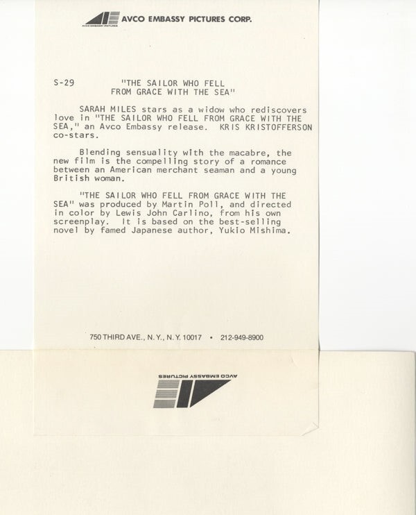 The Sailor Who Fell From Grace with the Sea Sarah Miles Profile Portrait Double Weight Original 8x10 Photo with Snipe 1976 Near Mint Condition This item is an ORIGINAL 8x10 photo from the historic archives of Silver Screen Mementos. This original photograph was made in the actual year the film, television show or event was produced. The movie studios produced publicity photographs for distribution to the press, photo agencies and publicity departments to advertise the film/tv show or event. Very often original photos have press release information on the reverse of the photo - movie credits, description of the scene, event and people involved. This is a historic piece of cinema art and is being offered from one collector to another, no rights given or implied. Silver Screen are gradually releasing thousands of Original Photographs, Transparencies, Negatives, Lobby Cards, Posters, Magazines and other memorabilia from our historic archive.