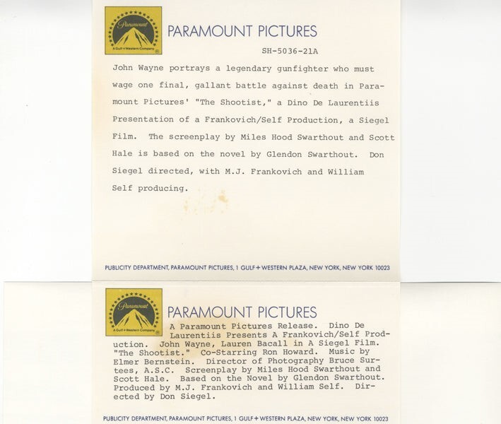 John Wayne The Shootist holding Western rifle Original 8x10 Photo with Snipe 1976 Near Mint Condition This item is an ORIGINAL 8x10 photo from the historic archives of Silver Screen Mementos. This original photograph was made in the actual year the film, television show or event was produced. The movie studios produced publicity photographs for distribution to the press, photo agencies and publicity departments to advertise the film/tv show or event. Very often original photos have press release information on the reverse of the photo - movie credits, description of the scene, event and people involved. This is a historic piece of cinema art and is being offered from one collector to another, no rights given or implied. Silver Screen are gradually releasing thousands of Original Photographs, Transparencies, Negatives, Lobby Cards, Posters, Magazines and other memorabilia from our historic archive.