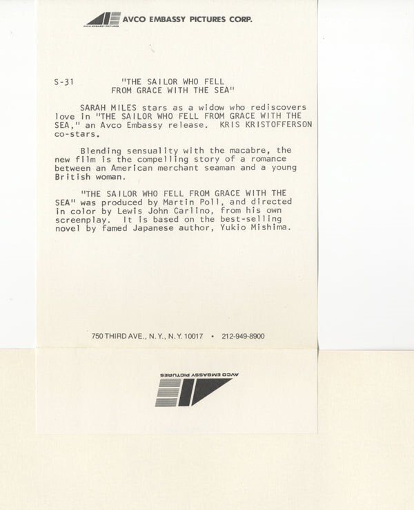 The Sailor Who Fell From Grace with the Sea Sarah Miles Double Weight Original 8x10 Photo with Snipe 1976 Near Mint Condition This item is an ORIGINAL 8x10 photo from the historic archives of Silver Screen Mementos. This original photograph was made in the actual year the film, television show or event was produced. The movie studios produced publicity photographs for distribution to the press, photo agencies and publicity departments to advertise the film/tv show or event. Very often original photos have press release information on the reverse of the photo - movie credits, description of the scene, event and people involved. This is a historic piece of cinema art and is being offered from one collector to another, no rights given or implied. Silver Screen are gradually releasing thousands of Original Photographs, Transparencies, Negatives, Lobby Cards, Posters, Magazines and other memorabilia from our historic archive.