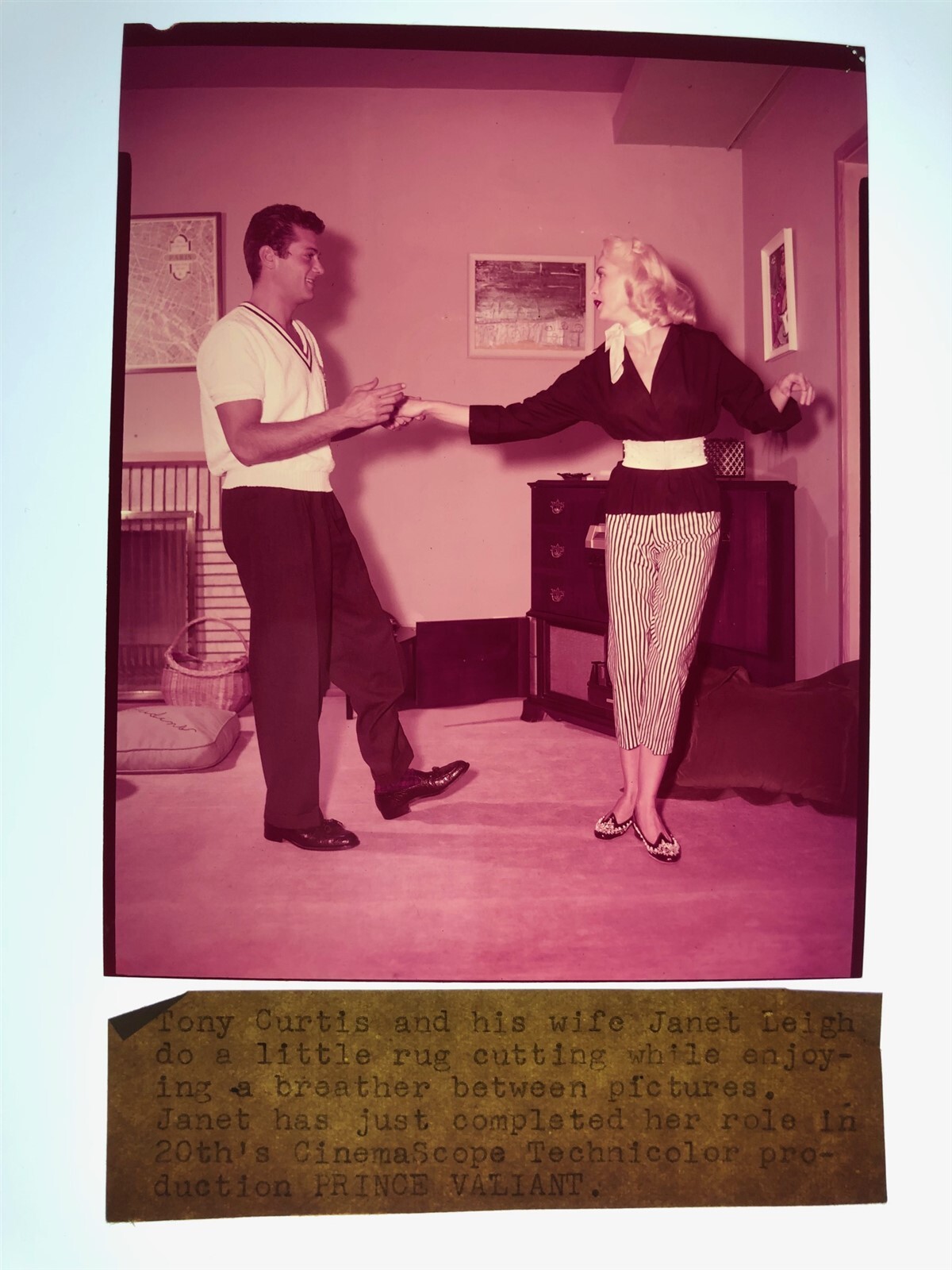 Tony Curtis & Janet Leigh at home 1954 Original 5x4 Transparency with original paper caption snipeThis is an original studio or photographer's 4x5 inches color slide transparency from our historic archive. This is a real collector's item and would make superb quality photographs or prints. This would also be a great addition to any collection or image archive. This original color slide transparency is in Excellent condition. This collector's item is being sold from one collector to another, no rights are given or implied. Silver Screen Mementos are gradually releasing from their vast archives thousands of original photographs, transparencies, negatives, slides, lobby cards and other movie or television memorabilia.