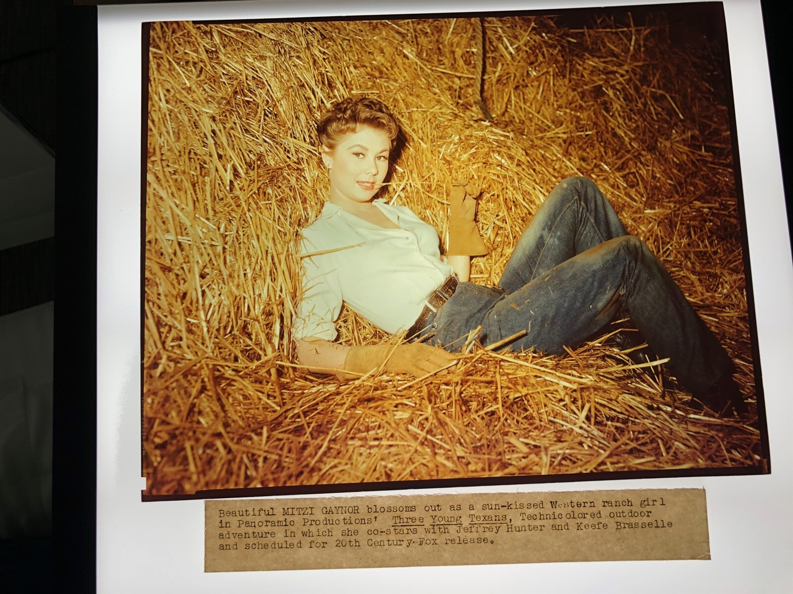 Mitzi Gaynor Glamour Pin Up in hay barn 1954 Three Young Texans Original 8x10 Transparency with original paper caption snipeThis is an original studio or photographer's 8x10 inches color slide transparency from our historic archive. This is a real collector's item and would make superb quality photographs or prints. This would also be a great addition to any collection or image archive. This original color slide transparency is in Excellent condition. This collector's item is being sold from one collector to another, no rights are given or implied. Silver Screen Mementos are gradually releasing from their vast archives thousands of original photographs, transparencies, negatives, slides, lobby cards and other movie or television memorabilia.
