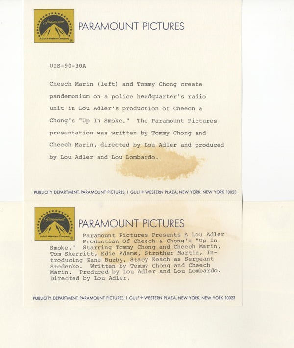 Up in Smoke Cheech Marin, Tommy Chong on intercom Original 8x10 Photo with Snipe 1978 Near Mint Condition This item is an ORIGINAL 8x10 photo from the historic archives of Silver Screen Mementos. This original photograph was made in the actual year the film, television show or event was produced. The movie studios produced publicity photographs for distribution to the press, photo agencies and publicity departments to advertise the film/tv show or event. Very often original photos have press release information on the reverse of the photo - movie credits, description of the scene, event and people involved. This is a historic piece of cinema art and is being offered from one collector to another, no rights given or implied. Silver Screen are gradually releasing thousands of Original Photographs, Transparencies, Negatives, Lobby Cards, Posters, Magazines and other memorabilia from our historic archive.