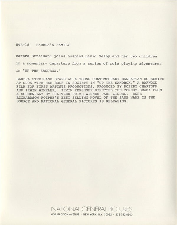 Up the Sandbox Barbra Streisand, David Selby, kids riding Carousel Original 8x10 Photo Stamped with Snipe 1972 Near Mint Condition This item is an ORIGINAL 8x10 photo from the historic archives of Silver Screen Mementos. This original photograph was made in the actual year the film, television show or event was produced. The movie studios produced publicity photographs for distribution to the press, photo agencies and publicity departments to advertise the film/tv show or event. Very often original photos have press release information on the reverse of the photo - movie credits, description of the scene, event and people involved. This is a historic piece of cinema art and is being offered from one collector to another, no rights given or implied. Silver Screen are gradually releasing thousands of Original Photographs, Transparencies, Negatives, Lobby Cards, Posters, Magazines and other memorabilia from our historic archive.