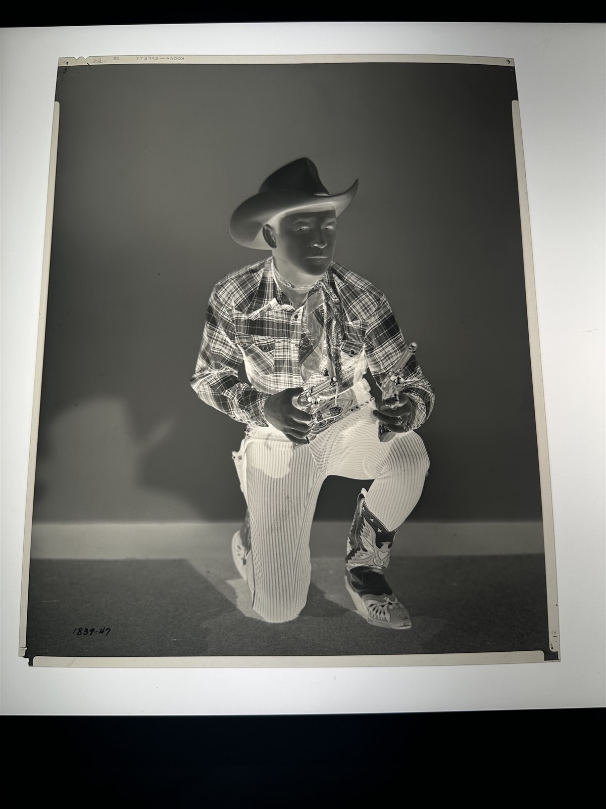 Roy Rogers 1951 In Old Amarillo holding pistols Original 8x10 Camera Negative with hand applied India Ink Code - A terrific portrait of the western icon being released from our historic archives. This is an original studio or photographer's 8x10 inches black and white photographic negative from our historic archive. This is a real collector's item and would make superb quality photographs or prints. This would also be a great addition to any collection or image archive. This original black and white photographic negative is in Excellent condition. This collector's item is being sold from one collector to another, no rights are given or implied. Silver Screen Mementos are gradually releasing from their vast archives thousands of original photographs, transparencies, negatives, slides, lobby cards and other movie or television memorabilia.