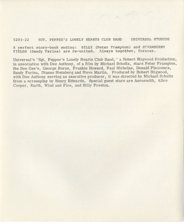 Sgt Pepper's Lonely Hearts Club Band Original 8x10 Photo Peter Frampton Sandy Farina 1978 This item is an ORIGINAL 8x10 photo from the historic archives of Silver Screen Mementos. This original photograph was made in the actual year the film, television show or event was produced. The movie studios produced publicity photographs for distribution to the press, photo agencies and publicity departments to advertise the film/tv show or event. Very often original photos have press release information on the reverse of the photo - movie credits, description of the scene, event and people involved. This is a historic piece of cinema art and is being offered from one collector to another, no rights given or implied. Silver Screen are gradually releasing thousands of Original Photographs, Transparencies, Negatives, Lobby Cards, Posters, Magazines and other memorabilia from our historic archive.