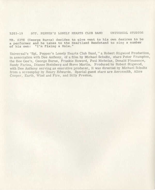 Sgt Pepper's Lonely Hearts Club Band Original 8x10 Photo George Burns 1978 Near Mint This item is an ORIGINAL 8x10 photo from the historic archives of Silver Screen Mementos. This original photograph was made in the actual year the film, television show or event was produced. The movie studios produced publicity photographs for distribution to the press, photo agencies and publicity departments to advertise the film/tv show or event. Very often original photos have press release information on the reverse of the photo - movie credits, description of the scene, event and people involved. This is a historic piece of cinema art and is being offered from one collector to another, no rights given or implied. Silver Screen are gradually releasing thousands of Original Photographs, Transparencies, Negatives, Lobby Cards, Posters, Magazines and other memorabilia from our historic archive.