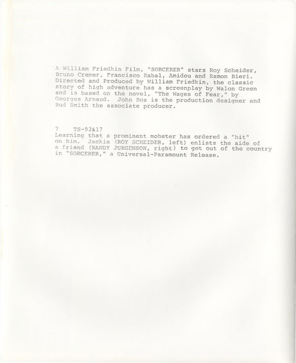 Sorcerer 1977 Original 8x10 Photo Roy Scheider Randy Jurgenson in the William Friedkin thriller - with snipe on back in Near Mint Condition This item is an ORIGINAL 8x10 photo from the historic archives of Silver Screen Mementos. This original photograph was made in the actual year the film, television show or event was produced. The movie studios produced publicity photographs for distribution to the press, photo agencies and publicity departments to advertise the film/tv show or event. Very often original photos have press release information on the reverse of the photo - movie credits, description of the scene, event and people involved. This is a historic piece of cinema art and is being offered from one collector to another, no rights given or implied. Silver Screen are gradually releasing thousands of Original Photographs, Transparencies, Negatives, Lobby Cards, Posters, Magazines and other memorabilia from our historic archive.