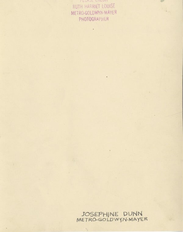 Josephine Dunn Original Autograph Signed Ruth Harriet Louise Stamped Photograph - An extremely rare Original MGM Studio Double Weight Silver Gelatin photograph stamped by MGM and famed photographer Ruth Harriet Louise, Autograph Signed in blue pen by "Josephine Dunn" circa mid 1920's. A wonderful portrait of the silent screen star by legendary pioneering female photographer Ruth Harriet Louise, a real treasure being offered in VG Condition (border trimmed from 8x10 inches ) -Ruth Harriet Louise's legacy as a pioneering photographer of the 1920s is marked by her extraordinary ability to capture the essence of Hollywood stars, making her work both historically invaluable and highly collectible. Hired as the first official portrait photographer for Metro-Goldwyn-Mayer (MGM) in 1925, Louise shattered gender norms and embarked on a remarkable career that would shape the public images of iconic actors and actresses. Louise's portraits transcend mere promotional images; they offer a window into the lives, personas, and cultural milieu of early Hollywood. Her photographs, characterized by their intimacy, elegance, and artistic composition, embody the glamour of the silent film era. The surviving prints showcase the stars who defined the industry, such as Greta Garbo, Joan Crawford, and Norma Shearer, adding to their allure and collectibility. What makes Louise's work even more collectible is its scarcity. Many of her photographs were lost or discarded over time due to a lack of preservation awareness. This scarcity has elevated the value of the surviving prints, which serve as rare artifacts that capture a pivotal period in both film and American cultural history. The increasing interest in vintage photography, film history, and memorabilia has led to a surge in demand for Louise's work. Collectors and enthusiasts alike are drawn to her portraits, appreciating the intersection of cinema and fine art. Her photographs hold a dual appeal, attracting not only film enthusiasts but also photography collectors, thereby expanding their reach within the collector community. Louise's ability to encapsulate the allure of Hollywood's golden era through her lens cements her status as a trailblazer in photography. Her work remains an enduring testament to the artistic and cultural significance of early cinema, making her photographs prized possessions for those who seek to own a tangible piece of Hollywood's past. This is an authentic vintage autographed item hand signed by the celebrity , not a copy. Silver Screen are gradually releasing thousands of Original Photographs, Transparencies, Negatives, Lobby Cards, Posters, Magazines and other memorabilia from our historic archive.