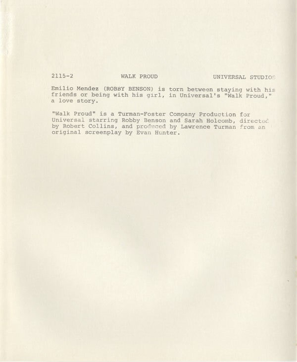 Robbie Benson Walk Proud wearing Sexy White Undershirt Original 8x10 Photo with Snipe 1979 Near Mint Condition This item is an ORIGINAL 8x10 photo from the historic archives of Silver Screen Mementos. This original photograph was made in the actual year the film, television show or event was produced. The movie studios produced publicity photographs for distribution to the press, photo agencies and publicity departments to advertise the film/tv show or event. Very often original photos have press release information on the reverse of the photo - movie credits, description of the scene, event and people involved. This is a historic piece of cinema art and is being offered from one collector to another, no rights given or implied. Silver Screen are gradually releasing thousands of Original Photographs, Transparencies, Negatives, Lobby Cards, Posters, Magazines and other memorabilia from our historic archive.