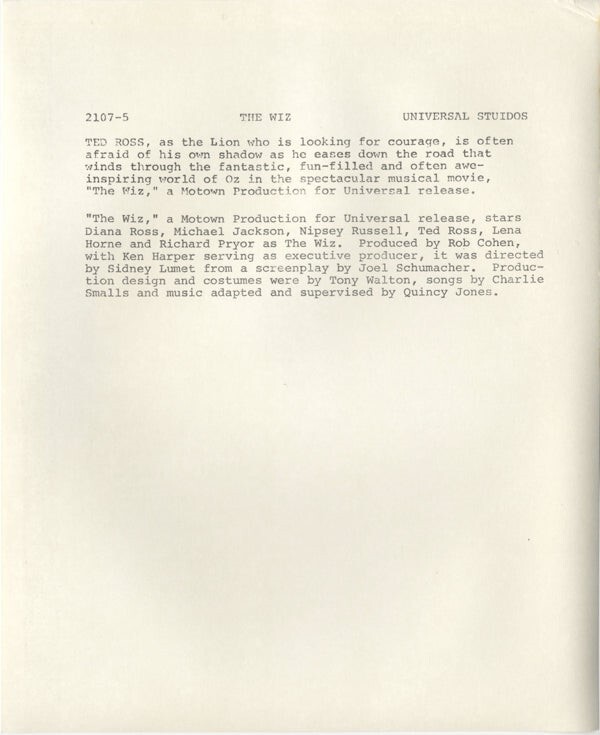 The Wiz Ted Ross The Cowardly Lion Portrait Original 8x10 Photo with Snipe 1978 Near Mint Condition This item is an ORIGINAL 8x10 photo from the historic archives of Silver Screen Mementos. This original photograph was made in the actual year the film, television show or event was produced. The movie studios produced publicity photographs for distribution to the press, photo agencies and publicity departments to advertise the film/tv show or event. Very often original photos have press release information on the reverse of the photo - movie credits, description of the scene, event and people involved. This is a historic piece of cinema art and is being offered from one collector to another, no rights given or implied. Silver Screen are gradually releasing thousands of Original Photographs, Transparencies, Negatives, Lobby Cards, Posters, Magazines and other memorabilia from our historic archive.