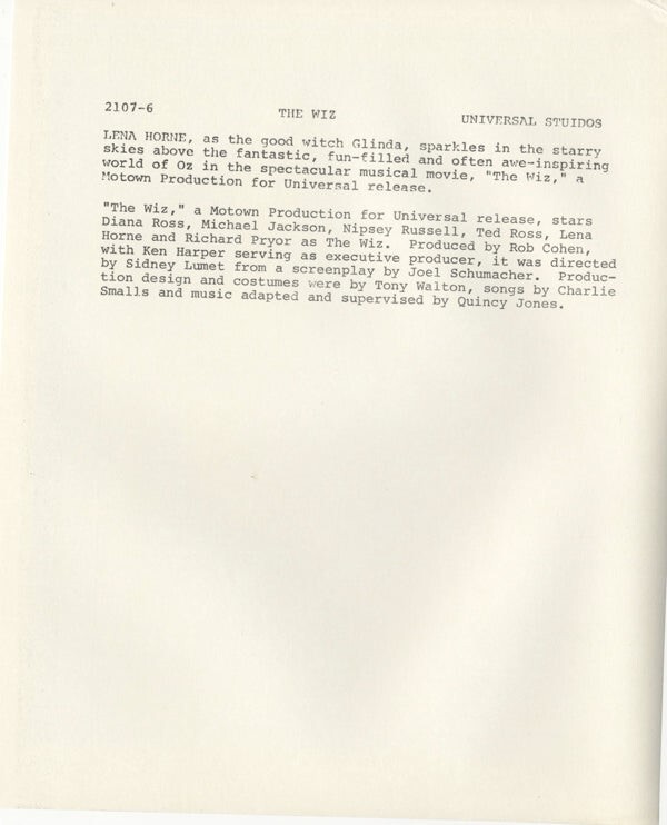 The Wiz Lena Horne Glinda the Good Witch Original 8x10 Photo with Snipe 1978 Near Mint Condition This item is an ORIGINAL 8x10 photo from the historic archives of Silver Screen Mementos. This original photograph was made in the actual year the film, television show or event was produced. The movie studios produced publicity photographs for distribution to the press, photo agencies and publicity departments to advertise the film/tv show or event. Very often original photos have press release information on the reverse of the photo - movie credits, description of the scene, event and people involved. This is a historic piece of cinema art and is being offered from one collector to another, no rights given or implied. Silver Screen are gradually releasing thousands of Original Photographs, Transparencies, Negatives, Lobby Cards, Posters, Magazines and other memorabilia from our historic archive.
