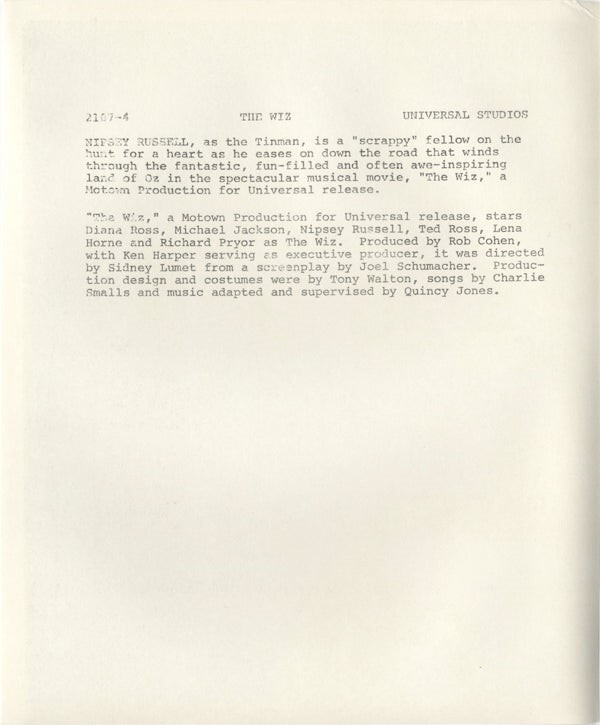 The Wiz Nipsey Russell Tin Man Portrait Original 8x10 Photo with Snipe 1978 Near Mint Condition This item is an ORIGINAL 8x10 photo from the historic archives of Silver Screen Mementos. This original photograph was made in the actual year the film, television show or event was produced. The movie studios produced publicity photographs for distribution to the press, photo agencies and publicity departments to advertise the film/tv show or event. Very often original photos have press release information on the reverse of the photo - movie credits, description of the scene, event and people involved. This is a historic piece of cinema art and is being offered from one collector to another, no rights given or implied. Silver Screen are gradually releasing thousands of Original Photographs, Transparencies, Negatives, Lobby Cards, Posters, Magazines and other memorabilia from our historic archive.
