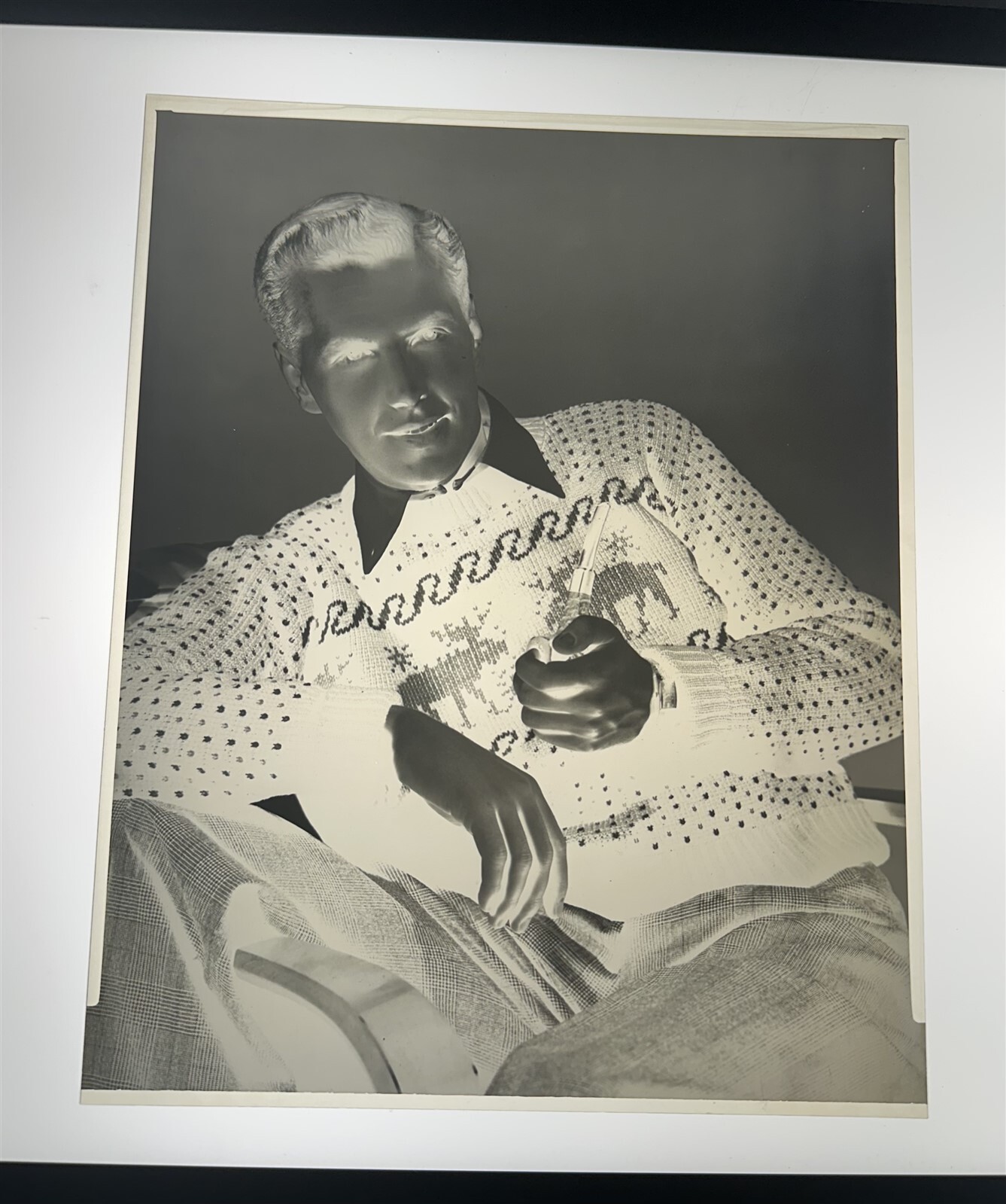 Robert Hutton holding pipe Christmas Sweater Photo Shoot Vintage 8x10 NegativeThis is an original studio or photographer's 8x10 inches black and white photographic negative from our historic archive. This is a real collector's item and would make superb quality photographs or prints. This would also be a great addition to any collection or image archive. This original black and white photographic negative is in Excellent condition. This collector's item is being sold from one collector to another, no rights are given or implied. Silver Screen Mementos are gradually releasing from their vast archives thousands of original photographs, transparencies, negatives, slides, lobby cards and other movie or television memorabilia.