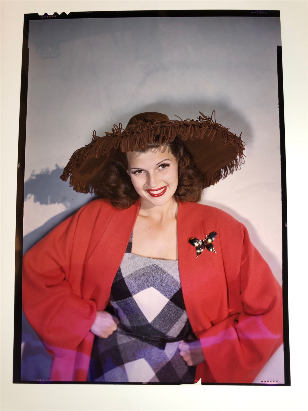 Rita Hayworth Breathtaking Vivid Color 1940's Glamour Portrait in red jacket and brownbrown summer hat Original 5x7 Transparency, A wonderful original 1940's transparency of the legendary star being released from our historic archives. This is an original studio or photographer's 5 x 7 inches color slide transparency from our historic archive. This is a real collector's item and would make superb quality photographs or prints. This would also be a great addition to any collection or image archive. This original color slide transparency is in Excellent condition. This collector's item is being sold from one collector to another, no rights are given or implied. Silver Screen Mementos are gradually releasing from their vast archives thousands of original photographs, transparencies, negatives, slides, lobby cards and other movie or television memorabilia.