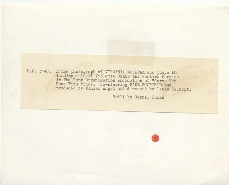 Virginia McKenna Glamour Portrait 1958 Carve Her Name With Pride Original Photo with paper caption snipe VG/Near Mint Condition This item is an ORIGINAL 8x10 photo from the historic archives of Silver Screen Mementos. This original photograph was made in the actual year the film, television show or event was produced. The movie studios produced publicity photographs for distribution to the press, photo agencies and publicity departments to advertise the film/tv show or event. Very often original photos have press release information on the reverse of the photo - movie credits, description of the scene, event and people involved. This is a historic piece of cinema art and is being offered from one collector to another, no rights given or implied. Silver Screen are gradually releasing thousands of Original Photographs, Transparencies, Negatives, Lobby Cards, Posters, Magazines and other memorabilia from our historic archive.