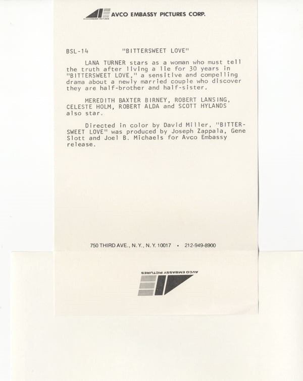 Lana Turner studio glamour portrait 1976 Bittersweet Love Original 8x10 Photo with paper caption snipe - Near Mint Condition This item is an ORIGINAL 8x10 photo from the historic archives of Silver Screen Mementos. This original photograph was made in the actual year the film, television show or event was produced. The movie studios produced publicity photographs for distribution to the press, photo agencies and publicity departments to advertise the film/tv show or event. Very often original photos have press release information on the reverse of the photo - movie credits, description of the scene, event and people involved. This is a historic piece of cinema art and is being offered from one collector to another, no rights given or implied. Silver Screen are gradually releasing thousands of Original Photographs, Transparencies, Negatives, Lobby Cards, Posters, Magazines and other memorabilia from our historic archive.