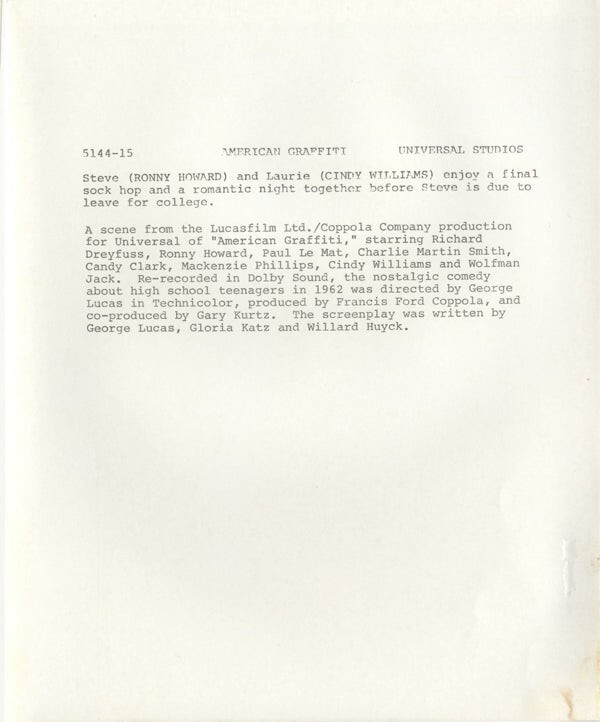 American Graffiti 1973 Cindy Williams Ron Howard High School Dance Original 8x10 Photo with snipe This item is an ORIGINAL 8x10 photo from the historic archives of Silver Screen Mementos. This original photograph was made in the actual year the film, television show or event was produced. The movie studios produced publicity photographs for distribution to the press, photo agencies and publicity departments to advertise the film/tv show or event. Very often original photos have press release information on the reverse of the photo - movie credits, description of the scene, event and people involved. This is a historic piece of cinema art and is being offered from one collector to another, no rights given or implied. Silver Screen are gradually releasing thousands of Original Photographs, Transparencies, Negatives, Lobby Cards, Posters, Magazines and other memorabilia from our historic archive.
