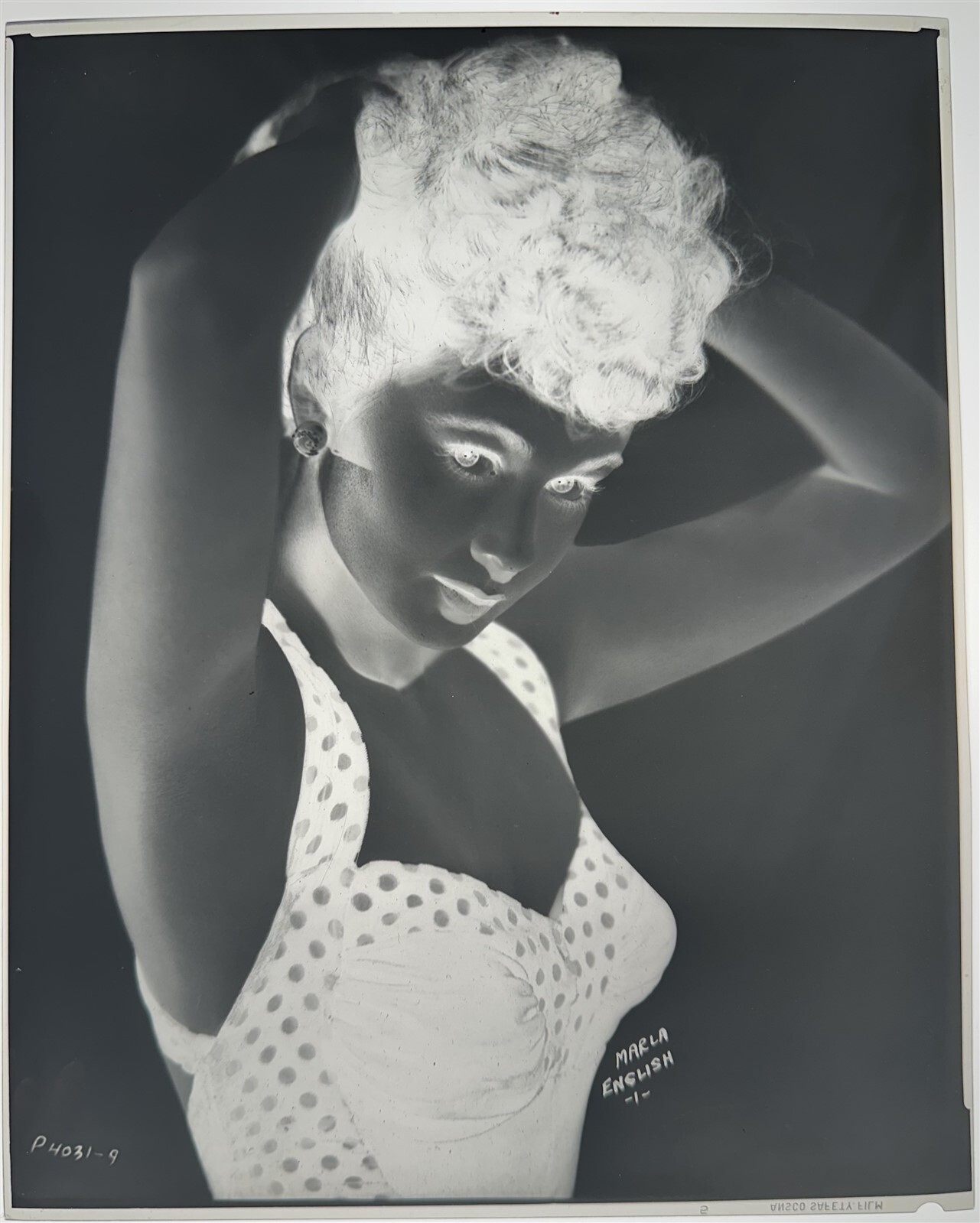 Marla English Sultry Studio Glamour Portrait Vintage Duplicate 8x10 Ansco Safety Film Negative This is a vintage studio or photographer's 8x10 inch black and white photographic negative from our historic archive. This vintage duplicate negative was created from the original camera negative by the studio or photographer in order to make prints and use for publications. This is a real collector's item and would make superb quality photographs or prints. This would also be a great addition to any collection or image archive. This black and white photographic negative is in Excellent condition. This collector's item is being sold from one collector to another, no rights are given or implied. Silver Screen Mementos are gradually releasing from their vast archives thousands of original photographs, transparencies, negatives, slides, lobby cards and other movie or television memorabilia.