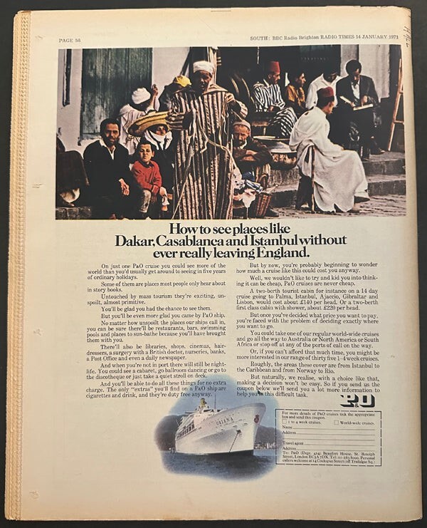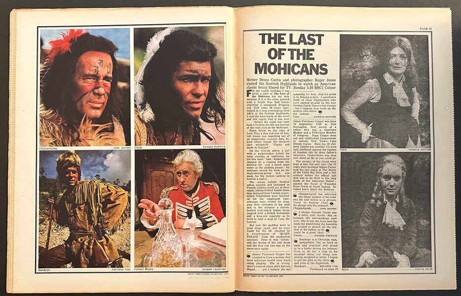 Radio Times Magazine 16-22 Jan 1971 Last of the Mohicans Philip Madoc cover This is a complete issue of the historic British Televison and Radio listings magazine ‘Radio Times’. This original vintage issue contains approximately 80 pages of TV and Radio listings, articles, interviews, pictures and features measuring approx 10x12 inches. Radio Times is a renowned and iconic British television and radio listings magazine that has been an integral part of the UK's media landscape for nearly a century. Established in 1923, it has consistently provided readers with comprehensive and insightful coverage of television and radio programming, making it an indispensable source of information and entertainment for millions of households across the United Kingdom. Publication History: Radio Times has a rich history, having been published continuously since its inception. Over the years, it has evolved from a simple radio listings guide to a multi-faceted entertainment magazine that covers a wide range of topics, including television, radio, film, and online streaming services. Format and Content: The magazine is typically published on a weekly basis and is available in both print and digital formats. It features a glossy cover, eye-catching design, and a wide variety of content to cater to the diverse interests of its readers. Key Sections and Content: TV and Radio Listings: The core of Radio Times is its comprehensive listings of television and radio programs for the week ahead. These listings are organized by date and time, making it easy for readers to plan their viewing and listening schedules. Editorial Content: In addition to listings, the magazine offers a wealth of editorial content. This includes feature articles, interviews with celebrities and industry professionals, reviews of upcoming shows and films, and in-depth analysis of current trends in the world of entertainment. Reviews and Recommendations: Radio Times provides critical reviews and recommendations for the latest TV shows, films, and radio programs. It also highlights must-watch or must-listen content, helping readers discover new and exciting entertainment options. Exclusive Previews: Readers can find exclusive previews of upcoming TV series and special events, giving them a sneak peek into what's on the horizon in the world of entertainment. Cultural and Lifestyle Features: The magazine doesn't limit itself to TV and radio alone. It covers broader cultural and lifestyle topics, including travel, food, technology, and fashion. Puzzles and Crosswords: Radio Times includes puzzles and crosswords to engage readers and provide a bit of brain-teasing entertainment. Special Issues: Throughout the year, Radio Times publishes special issues dedicated to major events, such as the Christmas and New Year TV schedules, major sporting events, and Impact and Legacy: As one of the oldest and most respected entertainment magazines in the UK, Radio Times has played a significant role in shaping the way the British public consumes television and radio content. It has become a cultural institution in its own right, with its name synonymous with the art of TV and radio listings. A real Collectors’ item being released from our historic archives, this is a complete vintage magazine. Silver Screen Mementos are gradually releasing from their vast archives thousands of original photographs, transparencies, negatives, slides, lobby cards, magazines, brochures, press books and other movie or television memorabilia.