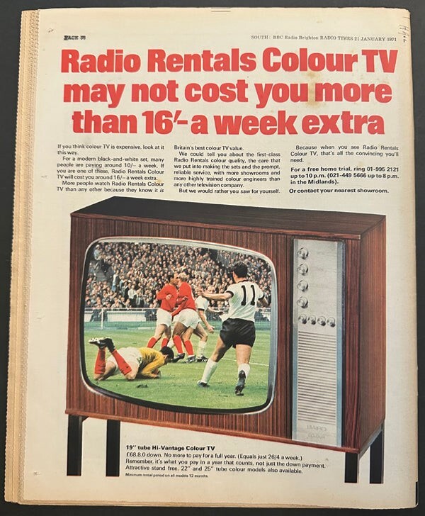 Radio Times Magazine 23-29 Jan 1971 Cilla Black Frankie Howerd Cover Mike Pratt This is a complete issue of the historic British Televison and Radio listings magazine ‘Radio Times’. This original vintage issue contains approximately 80 pages of TV and Radio listings, articles, interviews, pictures and features measuring approx 10x12 inches. Radio Times is a renowned and iconic British television and radio listings magazine that has been an integral part of the UK's media landscape for nearly a century. Established in 1923, it has consistently provided readers with comprehensive and insightful coverage of television and radio programming, making it an indispensable source of information and entertainment for millions of households across the United Kingdom. Publication History: Radio Times has a rich history, having been published continuously since its inception. Over the years, it has evolved from a simple radio listings guide to a multi-faceted entertainment magazine that covers a wide range of topics, including television, radio, film, and online streaming services. Format and Content: The magazine is typically published on a weekly basis and is available in both print and digital formats. It features a glossy cover, eye-catching design, and a wide variety of content to cater to the diverse interests of its readers. Key Sections and Content: TV and Radio Listings: The core of Radio Times is its comprehensive listings of television and radio programs for the week ahead. These listings are organized by date and time, making it easy for readers to plan their viewing and listening schedules. Editorial Content: In addition to listings, the magazine offers a wealth of editorial content. This includes feature articles, interviews with celebrities and industry professionals, reviews of upcoming shows and films, and in-depth analysis of current trends in the world of entertainment. Reviews and Recommendations: Radio Times provides critical reviews and recommendations for the latest TV shows, films, and radio programs. It also highlights must-watch or must-listen content, helping readers discover new and exciting entertainment options. Exclusive Previews: Readers can find exclusive previews of upcoming TV series and special events, giving them a sneak peek into what's on the horizon in the world of entertainment. Cultural and Lifestyle Features: The magazine doesn't limit itself to TV and radio alone. It covers broader cultural and lifestyle topics, including travel, food, technology, and fashion. Puzzles and Crosswords: Radio Times includes puzzles and crosswords to engage readers and provide a bit of brain-teasing entertainment. Special Issues: Throughout the year, Radio Times publishes special issues dedicated to major events, such as the Christmas and New Year TV schedules, major sporting events, and Impact and Legacy: As one of the oldest and most respected entertainment magazines in the UK, Radio Times has played a significant role in shaping the way the British public consumes television and radio content. It has become a cultural institution in its own right, with its name synonymous with the art of TV and radio listings. A real Collectors’ item being released from our historic archives, this is a complete vintage magazine. Silver Screen Mementos are gradually releasing from their vast archives thousands of original photographs, transparencies, negatives, slides, lobby cards, magazines, brochures, press books and other movie or television memorabilia.
