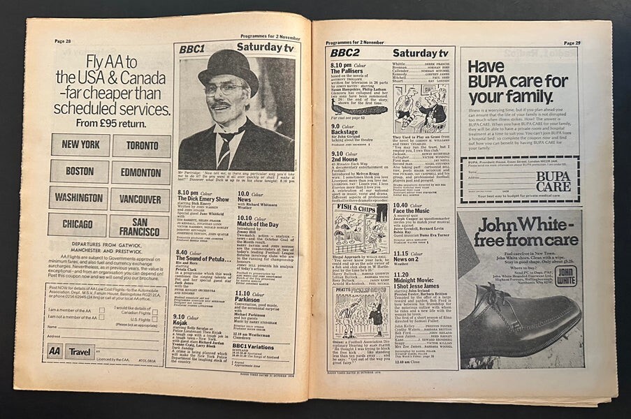 Radio Times Magazine 2-8 Nov 1974 George Chakiris Rosemary Harris Chopin BBC This is a complete issue of the historic British Televison and Radio listings magazine ‘Radio Times’. This original vintage issue contains approximately 80 pages of TV and Radio listings, articles, interviews, pictures and features measuring approx 10x12 inches. Radio Times is a renowned and iconic British television and radio listings magazine that has been an integral part of the UK's media landscape for nearly a century. Established in 1923, it has consistently provided readers with comprehensive and insightful coverage of television and radio programming, making it an indispensable source of information and entertainment for millions of households across the United Kingdom. Publication History: Radio Times has a rich history, having been published continuously since its inception. Over the years, it has evolved from a simple radio listings guide to a multi-faceted entertainment magazine that covers a wide range of topics, including television, radio, film, and online streaming services. Format and Content: The magazine is typically published on a weekly basis and is available in both print and digital formats. It features a glossy cover, eye-catching design, and a wide variety of content to cater to the diverse interests of its readers. Key Sections and Content: TV and Radio Listings: The core of Radio Times is its comprehensive listings of television and radio programs for the week ahead. These listings are organized by date and time, making it easy for readers to plan their viewing and listening schedules. Editorial Content: In addition to listings, the magazine offers a wealth of editorial content. This includes feature articles, interviews with celebrities and industry professionals, reviews of upcoming shows and films, and in-depth analysis of current trends in the world of entertainment. Reviews and Recommendations: Radio Times provides critical reviews and recommendations for the latest TV shows, films, and radio programs. It also highlights must-watch or must-listen content, helping readers discover new and exciting entertainment options. Exclusive Previews: Readers can find exclusive previews of upcoming TV series and special events, giving them a sneak peek into what's on the horizon in the world of entertainment. Cultural and Lifestyle Features: The magazine doesn't limit itself to TV and radio alone. It covers broader cultural and lifestyle topics, including travel, food, technology, and fashion. Puzzles and Crosswords: Radio Times includes puzzles and crosswords to engage readers and provide a bit of brain-teasing entertainment. Special Issues: Throughout the year, Radio Times publishes special issues dedicated to major events, such as the Christmas and New Year TV schedules, major sporting events, and Impact and Legacy: As one of the oldest and most respected entertainment magazines in the UK, Radio Times has played a significant role in shaping the way the British public consumes television and radio content. It has become a cultural institution in its own right, with its name synonymous with the art of TV and radio listings. A real Collectors’ item being released from our historic archives, this is a complete vintage magazine. Silver Screen Mementos are gradually releasing from their vast archives thousands of original photographs, transparencies, negatives, slides, lobby cards, magazines, brochures, press books and other movie or television memorabilia.