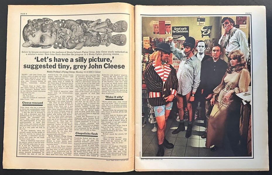 Radio Times Magazine 7-13 August 1971 BBC Rita Ridley Monty Python Ken Dodd This is a complete issue of the historic British Televison and Radio listings magazine ‘Radio Times’. This original vintage issue contains approximately 80 pages of TV and Radio listings, articles, interviews, pictures and features measuring approx 10x12 inches. Radio Times is a renowned and iconic British television and radio listings magazine that has been an integral part of the UK's media landscape for nearly a century. Established in 1923, it has consistently provided readers with comprehensive and insightful coverage of television and radio programming, making it an indispensable source of information and entertainment for millions of households across the United Kingdom. Publication History: Radio Times has a rich history, having been published continuously since its inception. Over the years, it has evolved from a simple radio listings guide to a multi-faceted entertainment magazine that covers a wide range of topics, including television, radio, film, and online streaming services. Format and Content: The magazine is typically published on a weekly basis and is available in both print and digital formats. It features a glossy cover, eye-catching design, and a wide variety of content to cater to the diverse interests of its readers. Key Sections and Content: TV and Radio Listings: The core of Radio Times is its comprehensive listings of television and radio programs for the week ahead. These listings are organized by date and time, making it easy for readers to plan their viewing and listening schedules. Editorial Content: In addition to listings, the magazine offers a wealth of editorial content. This includes feature articles, interviews with celebrities and industry professionals, reviews of upcoming shows and films, and in-depth analysis of current trends in the world of entertainment. Reviews and Recommendations: Radio Times provides critical reviews and recommendations for the latest TV shows, films, and radio programs. It also highlights must-watch or must-listen content, helping readers discover new and exciting entertainment options. Exclusive Previews: Readers can find exclusive previews of upcoming TV series and special events, giving them a sneak peek into what's on the horizon in the world of entertainment. Cultural and Lifestyle Features: The magazine doesn't limit itself to TV and radio alone. It covers broader cultural and lifestyle topics, including travel, food, technology, and fashion. Puzzles and Crosswords: Radio Times includes puzzles and crosswords to engage readers and provide a bit of brain-teasing entertainment. Special Issues: Throughout the year, Radio Times publishes special issues dedicated to major events, such as the Christmas and New Year TV schedules, major sporting events, and Impact and Legacy: As one of the oldest and most respected entertainment magazines in the UK, Radio Times has played a significant role in shaping the way the British public consumes television and radio content. It has become a cultural institution in its own right, with its name synonymous with the art of TV and radio listings. A real Collectors’ item being released from our historic archives, this is a complete vintage magazine. Silver Screen Mementos are gradually releasing from their vast archives thousands of original photographs, transparencies, negatives, slides, lobby cards, magazines, brochures, press books and other movie or television memorabilia.