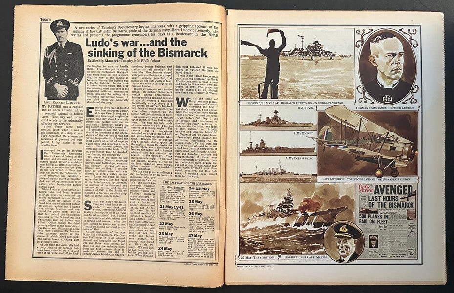 Radio Times Magazine 22-28 May 1971 Rex Harrison Cover Sink the Bismarck This is a complete issue of the historic British Televison and Radio listings magazine ‘Radio Times’. This original vintage issue contains approximately 80 pages of TV and Radio listings, articles, interviews, pictures and features measuring approx 10x12 inches. Radio Times is a renowned and iconic British television and radio listings magazine that has been an integral part of the UK's media landscape for nearly a century. Established in 1923, it has consistently provided readers with comprehensive and insightful coverage of television and radio programming, making it an indispensable source of information and entertainment for millions of households across the United Kingdom. Publication History: Radio Times has a rich history, having been published continuously since its inception. Over the years, it has evolved from a simple radio listings guide to a multi-faceted entertainment magazine that covers a wide range of topics, including television, radio, film, and online streaming services. Format and Content: The magazine is typically published on a weekly basis and is available in both print and digital formats. It features a glossy cover, eye-catching design, and a wide variety of content to cater to the diverse interests of its readers. Key Sections and Content: TV and Radio Listings: The core of Radio Times is its comprehensive listings of television and radio programs for the week ahead. These listings are organized by date and time, making it easy for readers to plan their viewing and listening schedules. Editorial Content: In addition to listings, the magazine offers a wealth of editorial content. This includes feature articles, interviews with celebrities and industry professionals, reviews of upcoming shows and films, and in-depth analysis of current trends in the world of entertainment. Reviews and Recommendations: Radio Times provides critical reviews and recommendations for the latest TV shows, films, and radio programs. It also highlights must-watch or must-listen content, helping readers discover new and exciting entertainment options. Exclusive Previews: Readers can find exclusive previews of upcoming TV series and special events, giving them a sneak peek into what's on the horizon in the world of entertainment. Cultural and Lifestyle Features: The magazine doesn't limit itself to TV and radio alone. It covers broader cultural and lifestyle topics, including travel, food, technology, and fashion. Puzzles and Crosswords: Radio Times includes puzzles and crosswords to engage readers and provide a bit of brain-teasing entertainment. Special Issues: Throughout the year, Radio Times publishes special issues dedicated to major events, such as the Christmas and New Year TV schedules, major sporting events, and Impact and Legacy: As one of the oldest and most respected entertainment magazines in the UK, Radio Times has played a significant role in shaping the way the British public consumes television and radio content. It has become a cultural institution in its own right, with its name synonymous with the art of TV and radio listings. A real Collectors’ item being released from our historic archives, this is a complete vintage magazine. Silver Screen Mementos are gradually releasing from their vast archives thousands of original photographs, transparencies, negatives, slides, lobby cards, magazines, brochures, press books and other movie or television memorabilia.