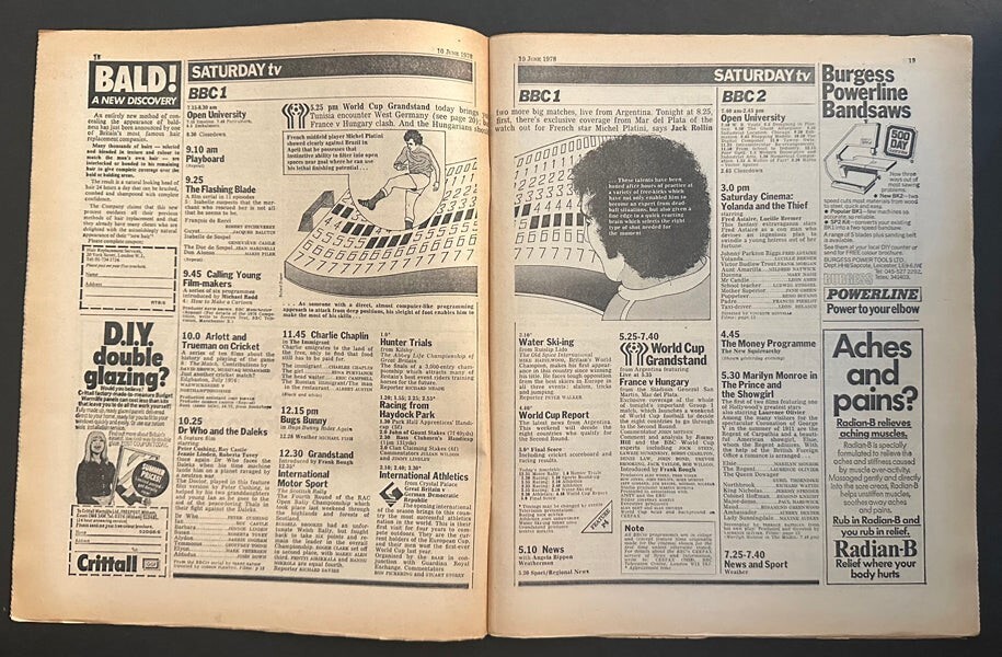 Radio Times Magazine BBC 10-16 June 1978 The Good Life Cover World Cup Football This is a complete issue of the historic British Televison and Radio listings magazine ‘Radio Times’. This original vintage issue contains approximately 80 pages of TV and Radio listings, articles, interviews, pictures and features measuring approx 10x12 inches. Radio Times is a renowned and iconic British television and radio listings magazine that has been an integral part of the UK's media landscape for nearly a century. Established in 1923, it has consistently provided readers with comprehensive and insightful coverage of television and radio programming, making it an indispensable source of information and entertainment for millions of households across the United Kingdom. Publication History: Radio Times has a rich history, having been published continuously since its inception. Over the years, it has evolved from a simple radio listings guide to a multi-faceted entertainment magazine that covers a wide range of topics, including television, radio, film, and online streaming services. Format and Content: The magazine is typically published on a weekly basis and is available in both print and digital formats. It features a glossy cover, eye-catching design, and a wide variety of content to cater to the diverse interests of its readers. Key Sections and Content: TV and Radio Listings: The core of Radio Times is its comprehensive listings of television and radio programs for the week ahead. These listings are organized by date and time, making it easy for readers to plan their viewing and listening schedules. Editorial Content: In addition to listings, the magazine offers a wealth of editorial content. This includes feature articles, interviews with celebrities and industry professionals, reviews of upcoming shows and films, and in-depth analysis of current trends in the world of entertainment. Reviews and Recommendations: Radio Times provides critical reviews and recommendations for the latest TV shows, films, and radio programs. It also highlights must-watch or must-listen content, helping readers discover new and exciting entertainment options. Exclusive Previews: Readers can find exclusive previews of upcoming TV series and special events, giving them a sneak peek into what's on the horizon in the world of entertainment. Cultural and Lifestyle Features: The magazine doesn't limit itself to TV and radio alone. It covers broader cultural and lifestyle topics, including travel, food, technology, and fashion. Puzzles and Crosswords: Radio Times includes puzzles and crosswords to engage readers and provide a bit of brain-teasing entertainment. Special Issues: Throughout the year, Radio Times publishes special issues dedicated to major events, such as the Christmas and New Year TV schedules, major sporting events, and Impact and Legacy: As one of the oldest and most respected entertainment magazines in the UK, Radio Times has played a significant role in shaping the way the British public consumes television and radio content. It has become a cultural institution in its own right, with its name synonymous with the art of TV and radio listings. A real Collectors’ item being released from our historic archives, this is a complete vintage magazine. Silver Screen Mementos are gradually releasing from their vast archives thousands of original photographs, transparencies, negatives, slides, lobby cards, magazines, brochures, press books and other movie or television memorabilia.