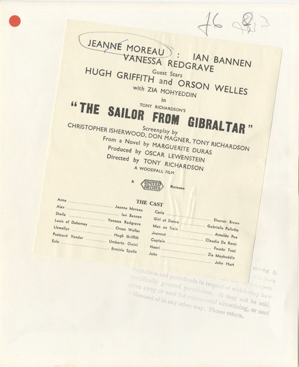 Jeanne Moreau laughing The Sailor From Gibraltar Original 8x10 Photo with snipe VG/Near Mint This item is an ORIGINAL 8x10 photo from the historic archives of Silver Screen Mementos. This original photograph was made in the actual year the film, television show or event was produced. The movie studios produced publicity photographs for distribution to the press, photo agencies and publicity departments to advertise the film/tv show or event. Very often original photos have press release information on the reverse of the photo - movie credits, description of the scene, event and people involved. This is a historic piece of cinema art and is being offered from one collector to another, no rights given or implied. Silver Screen are gradually releasing thousands of Original Photographs, Transparencies, Negatives, Lobby Cards, Posters, Magazines and other memorabilia from our historic archive.