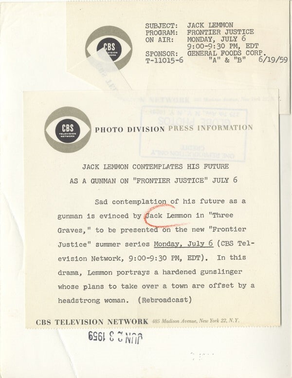 Jack Lemmon 1957 Zane Grey Theatre Three Graves Western Original 7x9 Photo Good Condition (crease in left corner) This item is an ORIGINAL 8x10 photo from the historic archives of Silver Screen Mementos. This original photograph was made in the actual year the film, television show or event was produced. The movie studios produced publicity photographs for distribution to the press, photo agencies and publicity departments to advertise the film/tv show or event. Very often original photos have press release information on the reverse of the photo - movie credits, description of the scene, event and people involved. This is a historic piece of cinema art and is being offered from one collector to another, no rights given or implied. Silver Screen are gradually releasing thousands of Original Photographs, Transparencies, Negatives, Lobby Cards, Posters, Magazines and other memorabilia from our historic archive.