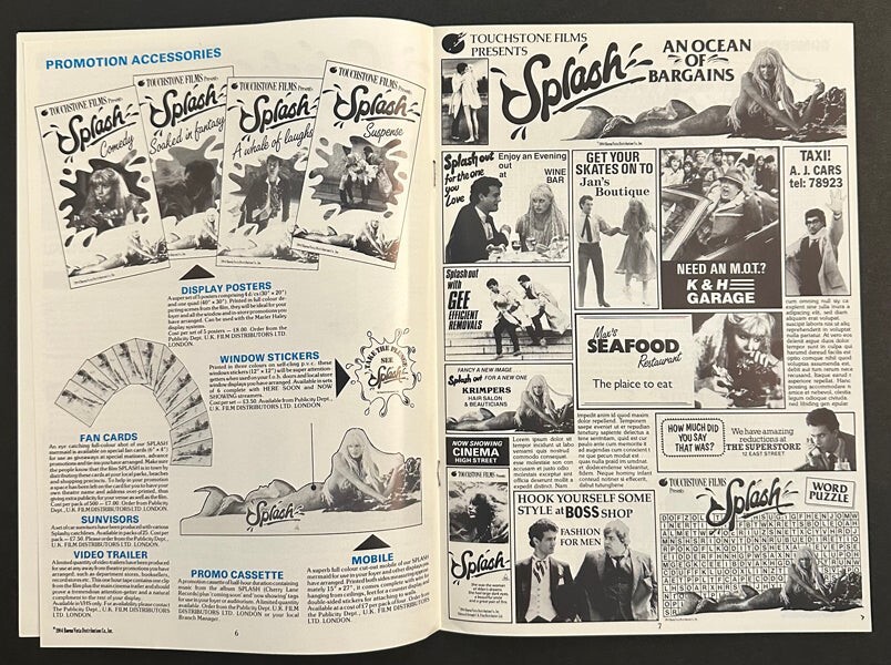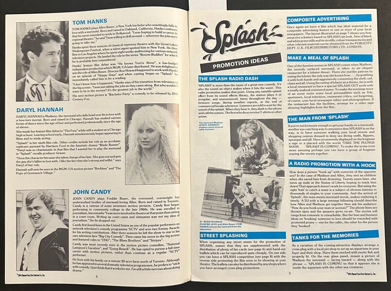 Splash 1984 Original 12 page UK Campain Pressbook featuring photos, poster art, puzzles, features and info for the classic comedy starring Darryl Hannah, Tom Hanks and John Candy. This is very rare and was not available to the general public, only cinema exhibitors. A real Collectors’ item being released from our historic archives, this is a complete vintage magazine. Silver Screen Mementos are gradually releasing from their vast archives thousands of original photographs, transparencies, negatives, slides, lobby cards, magazines, brochures, press books and other movie or television memorabilia. This collector's item is being sold from one collector to another, no rights are given or implied. Silver Screen Mementos are gradually releasing from their vast archives thousands of original photographs, transparencies, negatives, slides, lobby cards and other movie or television memorabilia.