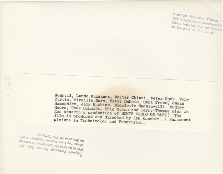Monte Carlo or Bust 1969 Gert Frobe Vintage Mercedes SSK Original Photo with paper caption snipe VG Condition (border trim) This item is an ORIGINAL 8x10 photo from the historic archives of Silver Screen Mementos. This original photograph was made in the actual year the film, television show or event was produced. The movie studios produced publicity photographs for distribution to the press, photo agencies and publicity departments to advertise the film/tv show or event. Very often original photos have press release information on the reverse of the photo - movie credits, description of the scene, event and people involved. This is a historic piece of cinema art and is being offered from one collector to another, no rights given or implied. Silver Screen are gradually releasing thousands of Original Photographs, Transparencies, Negatives, Lobby Cards, Posters, Magazines and other memorabilia from our historic archive.