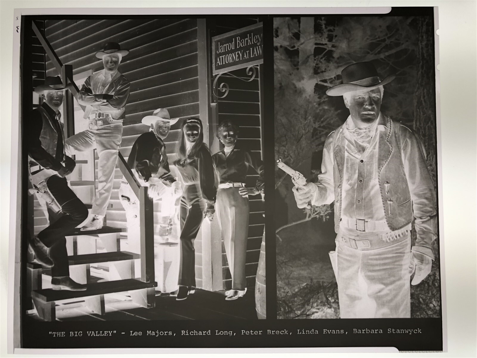 The Big Valley Lee Majors Barbara Stanwyck Linda Evans Richard Long and Peter Breck Vintage 8x10 studio Negative from the classic TV western This is an original studio or Record Company 8x10 inches black and white photographic negative from our historic archive. This was produced by the studio or record company to print 8x10 promotional photographs and may have the red masking tape and credit captions attached. This is a real collector's item and would make superb quality photographs or prints. This would also be a great addition to any collection or image archive. This Vintage studio black and white photographic negative is in Excellent condition. This collector's item is being sold from one collector to another, no rights are given or implied. Silver Screen Mementos are gradually releasing from their vast archives thousands of original photographs, transparencies, negatives, slides, lobby cards and other movie or television memorabilia.