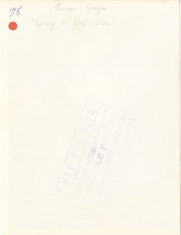 Susan George Beautiful Portrait 1970 Stamped Spring and Port Wine Original 7x9 approx Photo This item is an ORIGINAL 8x10 photo from the historic archives of Silver Screen Mementos. This original photograph was made in the actual year the film, television show or event was produced. The movie studios produced publicity photographs for distribution to the press, photo agencies and publicity departments to advertise the film/tv show or event. Very often original photos have press release information on the reverse of the photo - movie credits, description of the scene, event and people involved. This is a historic piece of cinema art and is being offered from one collector to another, no rights given or implied. Silver Screen are gradually releasing thousands of Original Photographs, Transparencies, Negatives, Lobby Cards, Posters, Magazines and other memorabilia from our historic archive.
