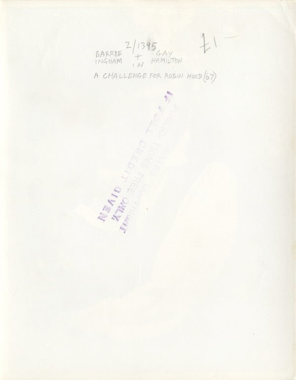 A Challenge for Robin Hood 1967 Barrie Ingham Gay Hamilton Original 8x10 Photo Hammer film Stamped VG/Near Mint Condition This item is an ORIGINAL 8x10 photo from the historic archives of Silver Screen Mementos. This original photograph was made in the actual year the film, television show or event was produced. The movie studios produced publicity photographs for distribution to the press, photo agencies and publicity departments to advertise the film/tv show or event. Very often original photos have press release information on the reverse of the photo - movie credits, description of the scene, event and people involved. This is a historic piece of cinema art and is being offered from one collector to another, no rights given or implied. Silver Screen are gradually releasing thousands of Original Photographs, Transparencies, Negatives, Lobby Cards, Posters, Magazines and other memorabilia from our historic archive.