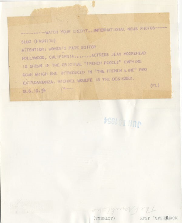 Jean Moorehaed French Poodle evening gown 1954 Original 7x9 Photo for the movie The French Linestamped with paper caption snipe in VG Condition This item is an ORIGINAL 8x10 photo from the historic archives of Silver Screen Mementos. This original photograph was made in the actual year the film, television show or event was produced. The movie studios produced publicity photographs for distribution to the press, photo agencies and publicity departments to advertise the film/tv show or event. Very often original photos have press release information on the reverse of the photo - movie credits, description of the scene, event and people involved. This is a historic piece of cinema art and is being offered from one collector to another, no rights given or implied. Silver Screen are gradually releasing thousands of Original Photographs, Transparencies, Negatives, Lobby Cards, Posters, Magazines and other memorabilia from our historic archive.