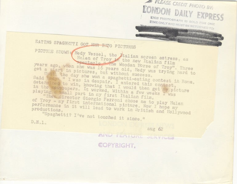 Edy Vessel The Trojan Horse aka La guerra di Troia Exotic Alluring Glamour Original 7x9 Photo with Snipe 1962 Near Mint Condition This item is an ORIGINAL 8x10 photo from the historic archives of Silver Screen Mementos. This original photograph was made in the actual year the film, television show or event was produced. The movie studios produced publicity photographs for distribution to the press, photo agencies and publicity departments to advertise the film/tv show or event. Very often original photos have press release information on the reverse of the photo - movie credits, description of the scene, event and people involved. This is a historic piece of cinema art and is being offered from one collector to another, no rights given or implied. Silver Screen are gradually releasing thousands of Original Photographs, Transparencies, Negatives, Lobby Cards, Posters, Magazines and other memorabilia from our historic archive.