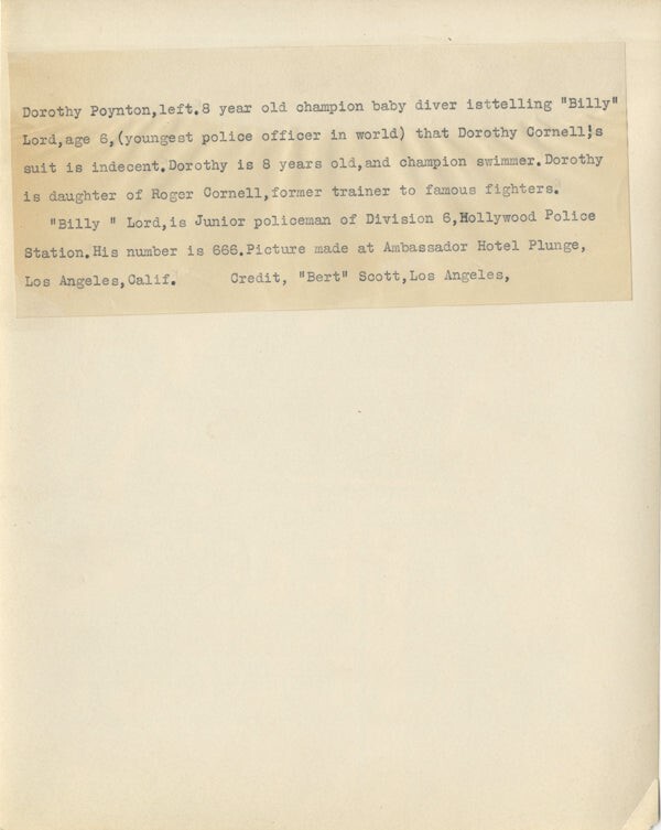1923 Dorothy Poynton-Hill Olympic Champion Diver Historic Original 8x10 Photo as an 8 year old posing with Billy Lord (the World'd youngest police officer) and Dorothy Cornell - very rare and unique photograph with original paper caption snipe in VG Condition This is an Original Photograph measuring approx 8x10 inches. Silver Screen Mementos has recently acquired another large archive of amazing and extremely rare original photographs from the Silent era through the early 'Talkies' and beyond. We will gradually be releasing some of these rare treasures, including some wonderful Original photographs of Louise Brooks, Fay Wray, Clara Bow, Charles Chaplin, Jean Arthur, Gary Cooper, Albert Einstein, Jean Harlow and Carole Lombard. This is a historic piece of cinema art and is being offered from one collector to another, no rights given or implied. Silver Screen Mementos are gradually releasing thousands of Original Photographs, Transparencies, Slides, Lobby Cards, Movie Posters, Magazines and other entertainment memorabilia from its historic archives.