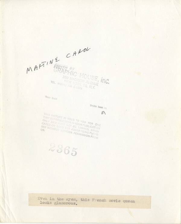 Martine Carol Leggy pose on bed French actress Stamped Origginal 8x10 Photograph Good Condition (1 inch tear top , no paper loss) This item is an ORIGINAL 8x10 photo from the historic archives of Silver Screen Mementos. This original photograph was made in the actual year the film, television show or event was produced. The movie studios produced publicity photographs for distribution to the press, photo agencies and publicity departments to advertise the film/tv show or event. Very often original photos have press release information on the reverse of the photo - movie credits, description of the scene, event and people involved. This is a historic piece of cinema art and is being offered from one collector to another, no rights given or implied. Silver Screen are gradually releasing thousands of Original Photographs, Transparencies, Negatives, Lobby Cards, Posters, Magazines and other memorabilia from our historic archive.