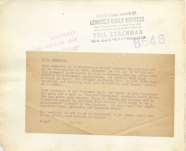 Elga Anderson Barefoot German actress singer Glamour Pin Up Original 8x10 Photo 1958 stamped and with paper caption snipe VG Condition This item is an ORIGINAL 8x10 photo from the historic archives of Silver Screen Mementos. This original photograph was made in the actual year the film, television show or event was produced. The movie studios produced publicity photographs for distribution to the press, photo agencies and publicity departments to advertise the film/tv show or event. Very often original photos have press release information on the reverse of the photo - movie credits, description of the scene, event and people involved. This is a historic piece of cinema art and is being offered from one collector to another, no rights given or implied. Silver Screen are gradually releasing thousands of Original Photographs, Transparencies, Negatives, Lobby Cards, Posters, Magazines and other memorabilia from our historic archive.