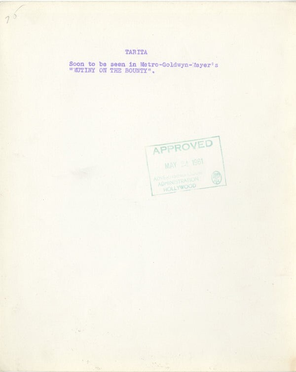 Tarita Beautiful Exotic Glamour Portrait 1961 Mutiny on the Bounty Original 8x10 Photo, stamped on back in VG/Near Mint Condition This item is an ORIGINAL 8x10 photo from the historic archives of Silver Screen Mementos. This original photograph was made in the actual year the film, television show or event was produced. The movie studios produced publicity photographs for distribution to the press, photo agencies and publicity departments to advertise the film/tv show or event. Very often original photos have press release information on the reverse of the photo - movie credits, description of the scene, event and people involved. This is a historic piece of cinema art and is being offered from one collector to another, no rights given or implied. Silver Screen are gradually releasing thousands of Original Photographs, Transparencies, Negatives, Lobby Cards, Posters, Magazines and other memorabilia from our historic archive.