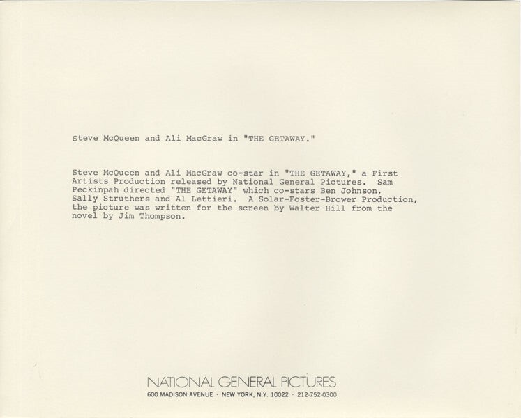 The Getaway 1972 Steve McQueen shotgun Ali MacGraw Original 8x10 Photo with snipe Near Mint Condition This item is an ORIGINAL 8x10 photo from the historic archives of Silver Screen Mementos. This original photograph was made in the actual year the film, television show or event was produced. The movie studios produced publicity photographs for distribution to the press, photo agencies and publicity departments to advertise the film/tv show or event. Very often original photos have press release information on the reverse of the photo - movie credits, description of the scene, event and people involved. This is a historic piece of cinema art and is being offered from one collector to another, no rights given or implied. Silver Screen are gradually releasing thousands of Original Photographs, Transparencies, Negatives, Lobby Cards, Posters, Magazines and other memorabilia from our historic archive.