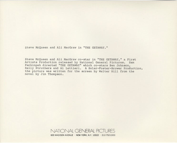 The Getaway 1972 Steve McQueen Ali MacGraw money on bed Original 8x10 Photo with snipe on back , great photograph in Near Mint Condition This item is an ORIGINAL 8x10 photo from the historic archives of Silver Screen Mementos. This original photograph was made in the actual year the film, television show or event was produced. The movie studios produced publicity photographs for distribution to the press, photo agencies and publicity departments to advertise the film/tv show or event. Very often original photos have press release information on the reverse of the photo - movie credits, description of the scene, event and people involved. This is a historic piece of cinema art and is being offered from one collector to another, no rights given or implied. Silver Screen are gradually releasing thousands of Original Photographs, Transparencies, Negatives, Lobby Cards, Posters, Magazines and other memorabilia from our historic archive.