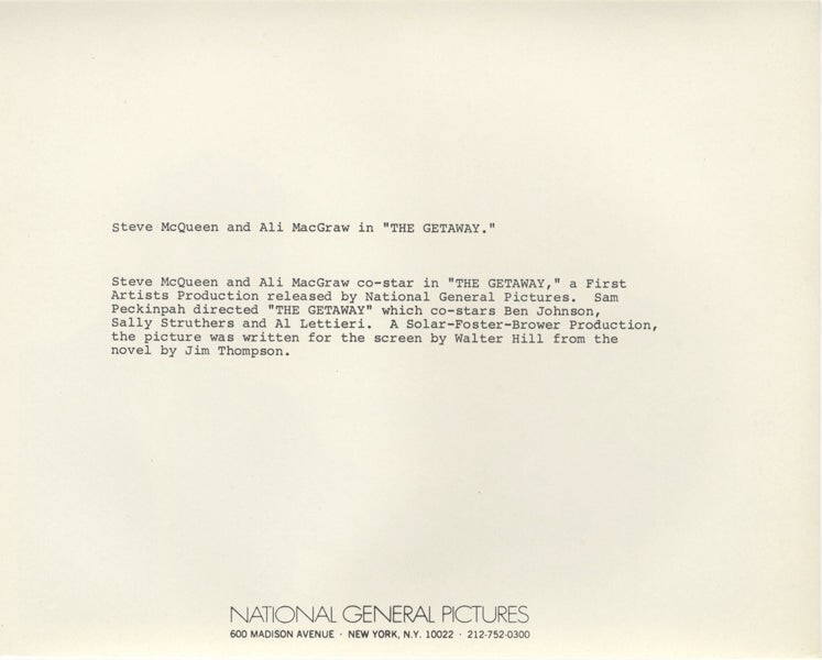 The Getaway 1972 Steve McQueen slapping Ali MacGraw Original 8x10 Photo with snipe Near Mint Condition This item is an ORIGINAL 8x10 photo from the historic archives of Silver Screen Mementos. This original photograph was made in the actual year the film, television show or event was produced. The movie studios produced publicity photographs for distribution to the press, photo agencies and publicity departments to advertise the film/tv show or event. Very often original photos have press release information on the reverse of the photo - movie credits, description of the scene, event and people involved. This is a historic piece of cinema art and is being offered from one collector to another, no rights given or implied. Silver Screen are gradually releasing thousands of Original Photographs, Transparencies, Negatives, Lobby Cards, Posters, Magazines and other memorabilia from our historic archive.